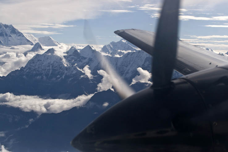 Your flight will require that you rise early and make your way to Tribhuvan Domestic Airport. Several private airlines offer mountain flights, and we use them all, as they are equally reliable. The aircraft are small, twin-engined 18-seater planes, - Jetstream-41, Twin Otter De Havilland-DHC-6/300, Beech-1900Ds and Dornier-DO228. The seat configuration is a single row on each side, which means that you will have your own uninterrupted mountain view. Beside that, we can also arrange for private, mountain sightseeing on an hourly basis for about 5 people, in small Ecureuil-AS350 helicopters. (If you are interested in this latter option, please get in touch with us).