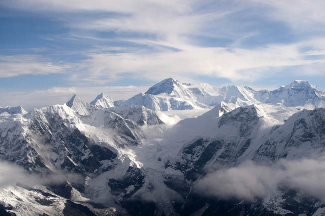 Next in view is Chhoba Bhamare, the smallest of all the peaks seen on the flight, at 5933m, but thus far defying climbing attempts. Then comes Mt. Gauri Shankar (7134m), sharp and conspicuous, and believed by Hindus to be protected by Lord Shiva and his consort Gauri.