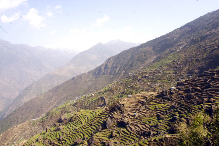 After a long descent through terraced fields, the road crosses the Tadi Khola, then climbs onto a plateau and passes fields of mustard, maize and rice planted in bright red soil. There is a police check post 2 km before Trisuli Bazaar where trekking permits are usually examined.